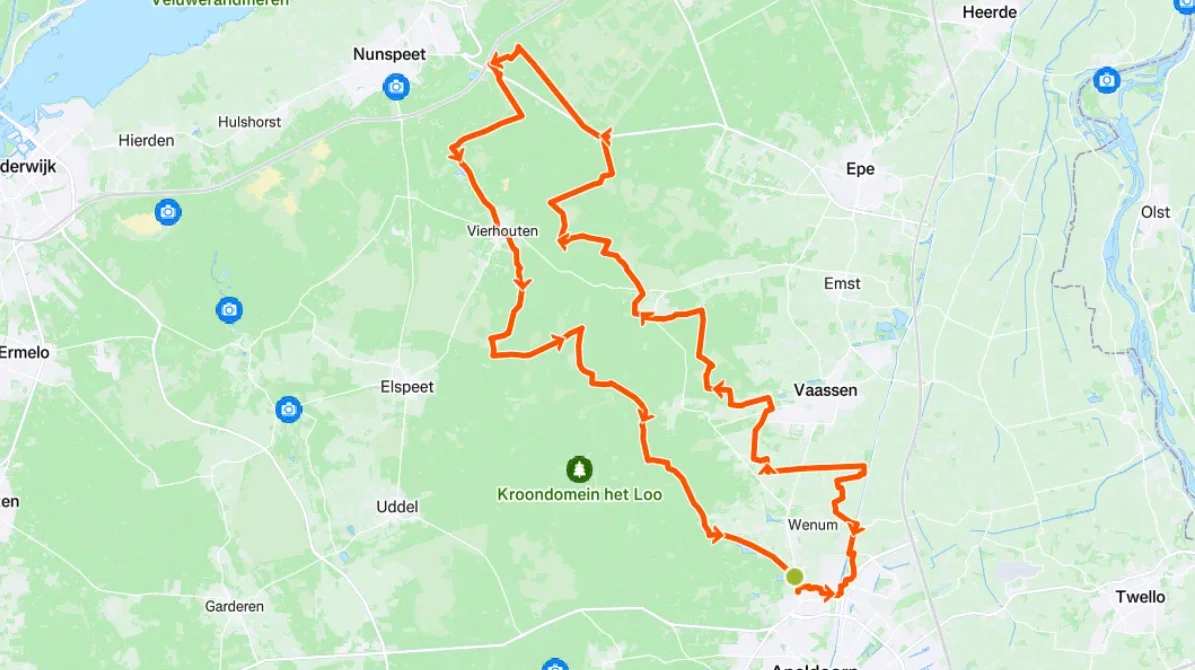 Na een ronde van ongeveer 61 km keer je terug naar Apeldoorn. Je hebt een mix van uitdagende gravelpaden, rustige boswegen, en adembenemende uitzichten ervaren.